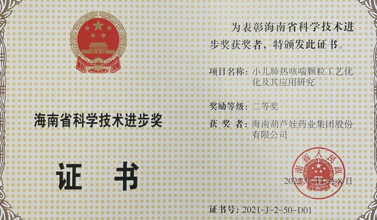 财神争霸药业集团申报的专利“克咳片及其制备方法”荣获 第四届海南省专利奖金奖