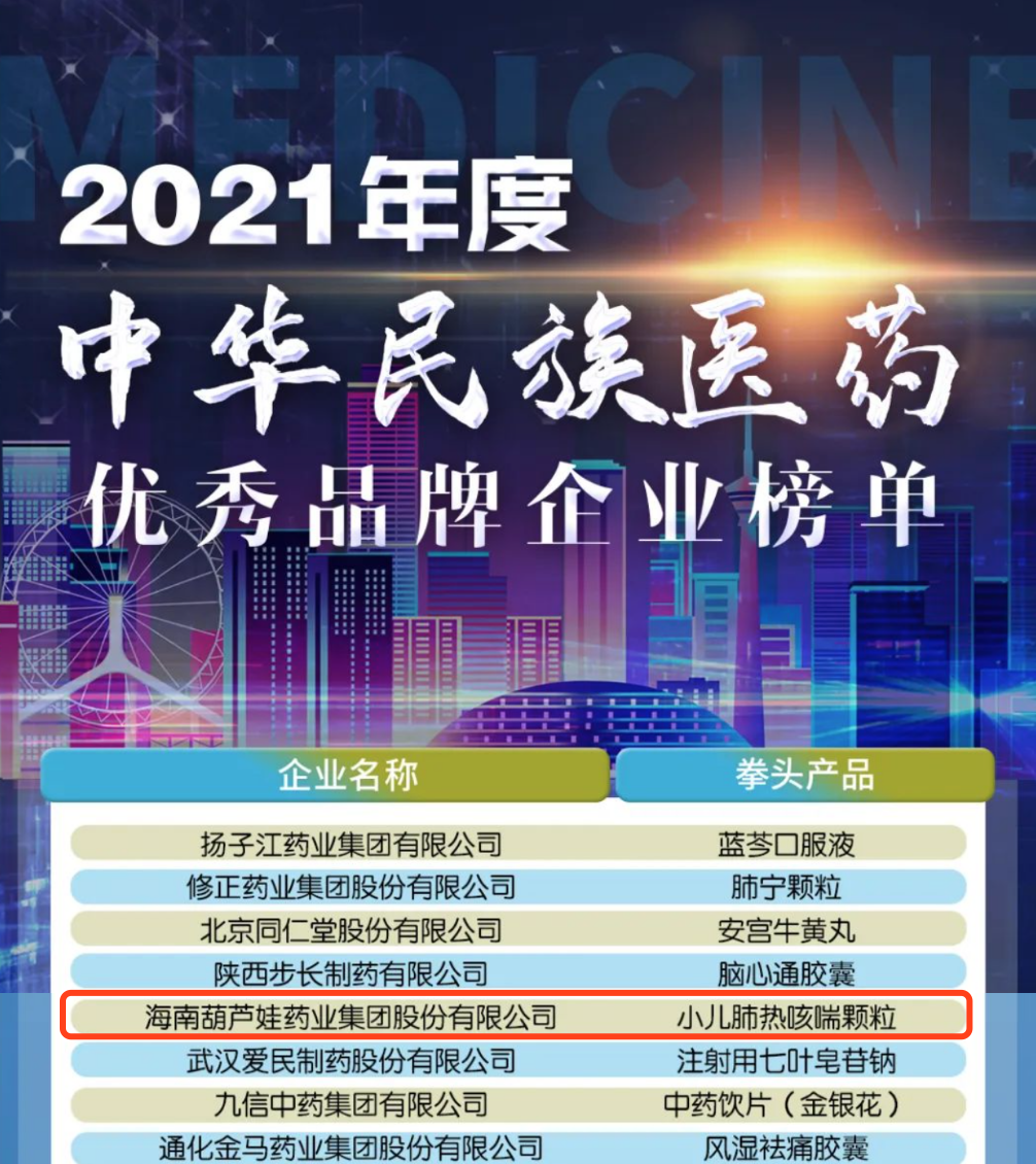 12月29日,全国工商联医药业商会发布了“2021年度中华民族医药优秀品牌企业榜单”,财神争霸药业集团凭借黄金单品小儿肺热咳喘颗粒(4克)实力登榜。